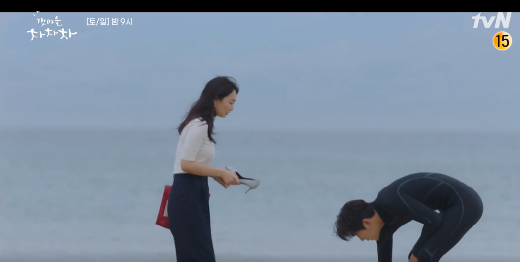 마침 서핑보드를 타고 있던 두식(김선호)이 구두 한 짝을 건네주고 신발을 잃어버린 혜진에게 슬리퍼를