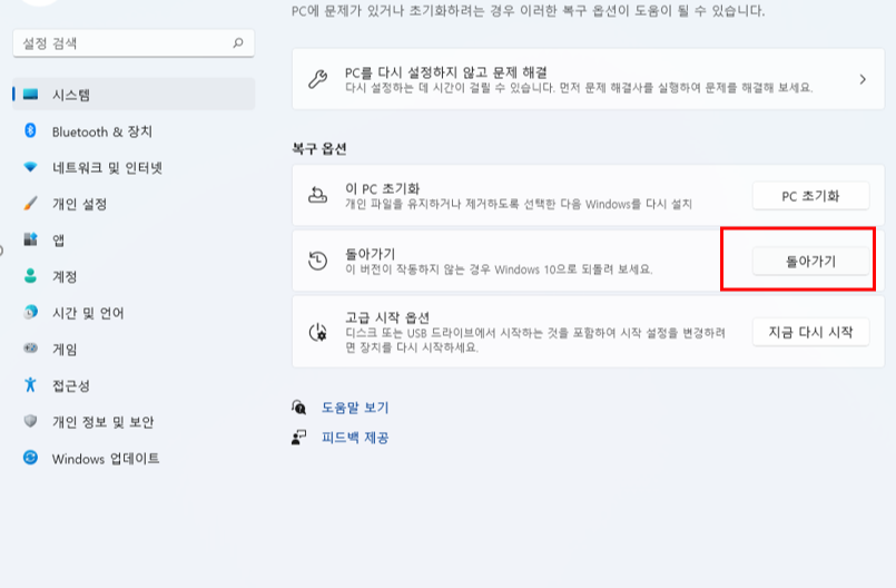 시스템 -> 복구-> 돌아가기 클릭