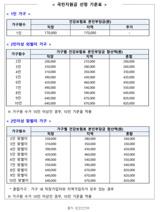 국민 지원금 재상은 건강보홈료 가구별 합산액 선정기준인데 1인 가구는 무조건 직장, 지역 가입자 상관없이 건강보험료 17만 원 이하면 가능 아래 국민 지원금 선정기준표를 참고하시면 될 것 같습니다.