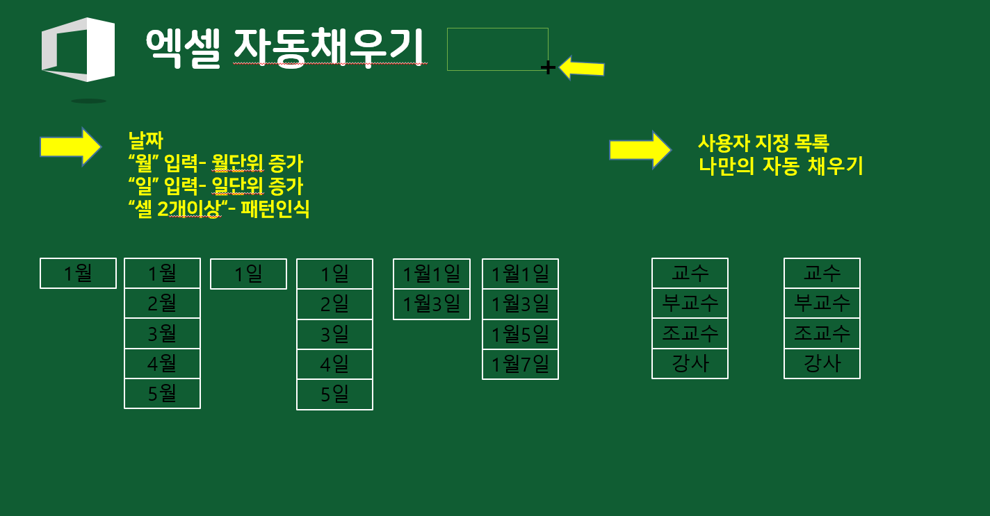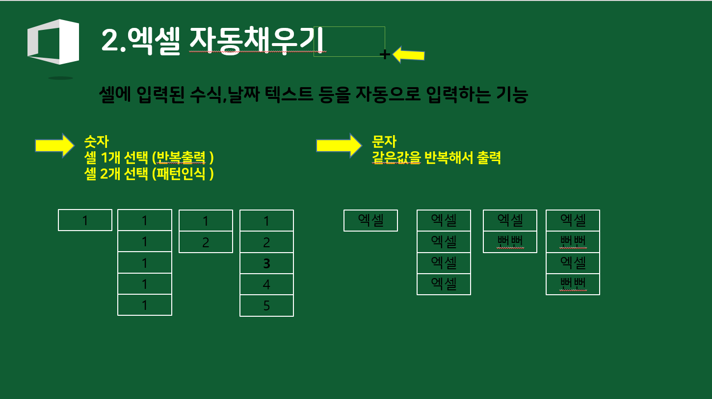 셀에 입력된 수식, 날짜 텍스트 등을 자동으로 입력 하는 기능으로